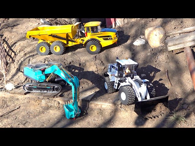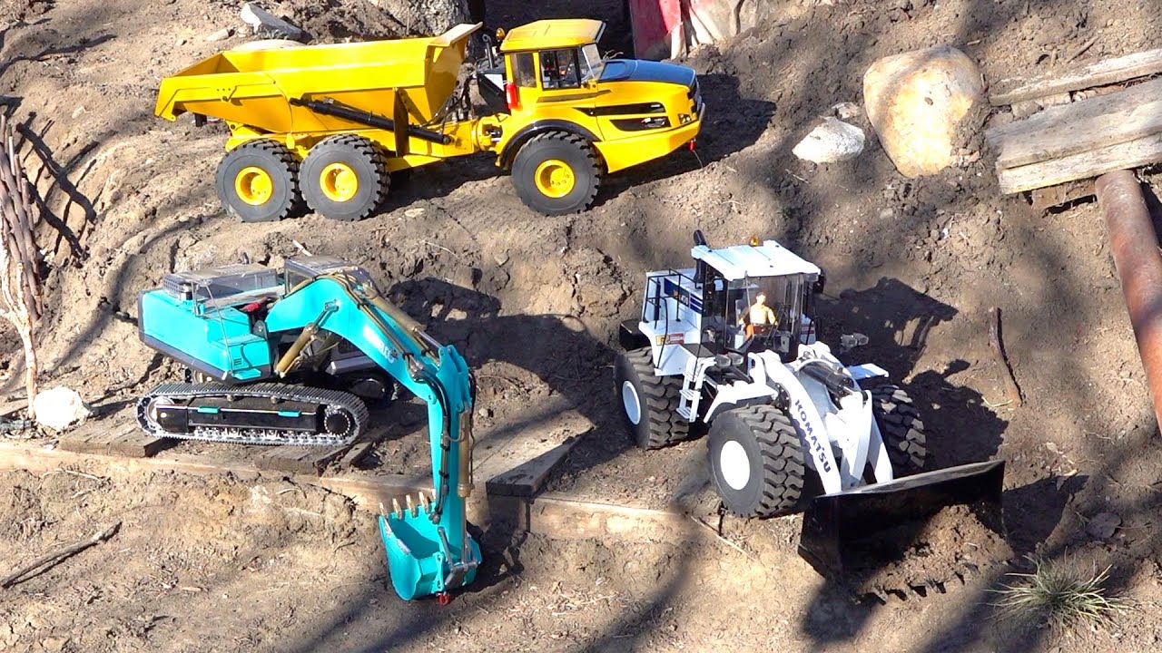 My LESU "Kobelco" Excavator and many other heavy duty machines mobilize into my backyard scale trail park to fulfill the requests of many of our viewers! Recently I have been putting time into my park making changes and adding new ideas, as we are locked at home during the 2020 health crisis. During one of my last films, viewers asked if I have ever used my collection of 1/14th scale electric / hydraulic construction equipment to assist me. Specifically this - I HAD NOT! So, to fulfill this request - I tried to make todays episode EXTRA SPECIAL - and brought out many of my models! ALL OF THEM are HEAVY. HAH! The work is about to begin - and I have to remove several Old Redwood Trees from the property. These old trees have been dead for years.. and they gotta go! We never use them in the off road park.. and we figure that the NEW Equipment, Mixed with out Older Equipment was JUST ENOUGh to get the job done. Thankfully I had a ton of batteries to aid and assist. Sit back and enjoy the story.. it should be entertaining!